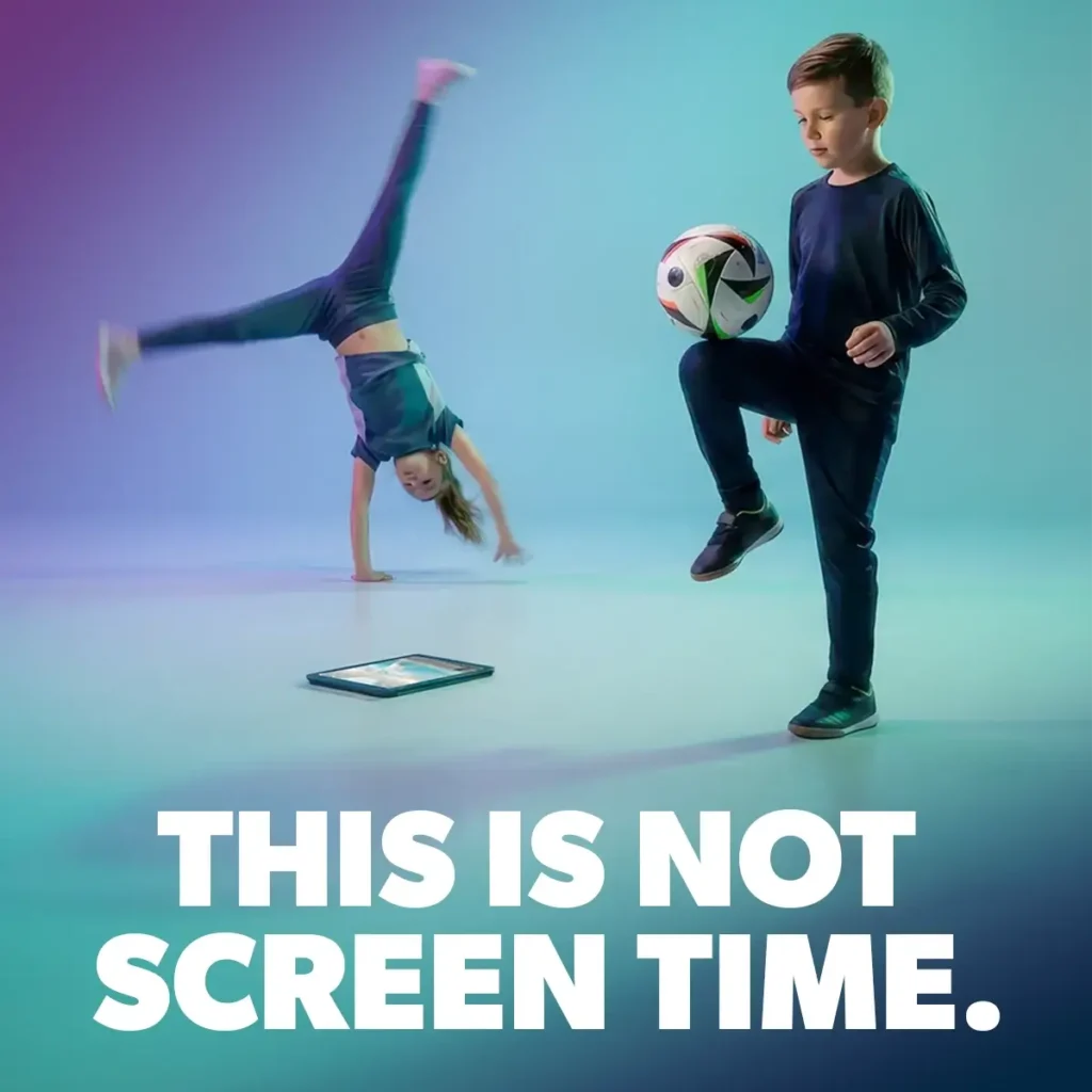 Children follow clear voice guidance and move freely without staring at the screen. This keeps focus on the body, space and movement – not tapping or swiping.