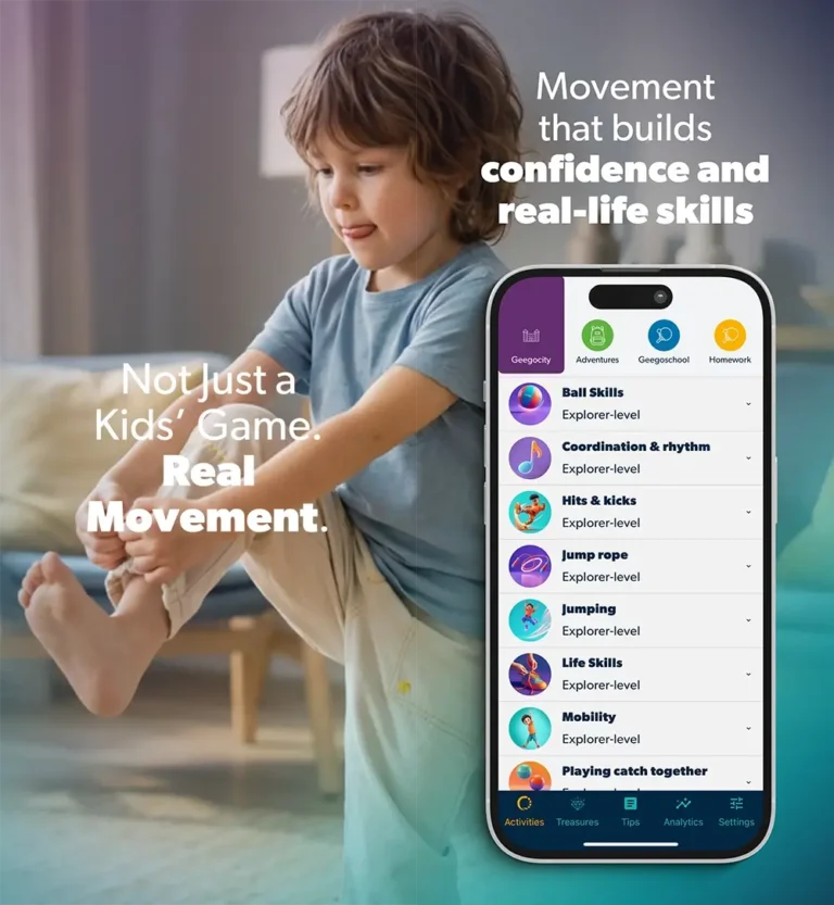 Geego adapts difficulty and offers surprise challenges that keep kids motivated. This helps children discover what they enjoy and what they’re good at.